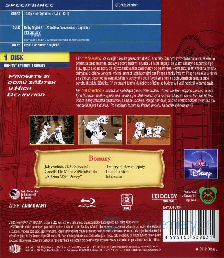 Blu-ray film 101 Dalmatinů [1961]. Český dabing. České titulky. Dolby Digital. Film 101 Dalmatinů učaroval již několika generacím diváků, a to díky úžasným čtyřnohým hrdinům, skvělému příběhu a báječné směsi zábavy a dobrodružství.