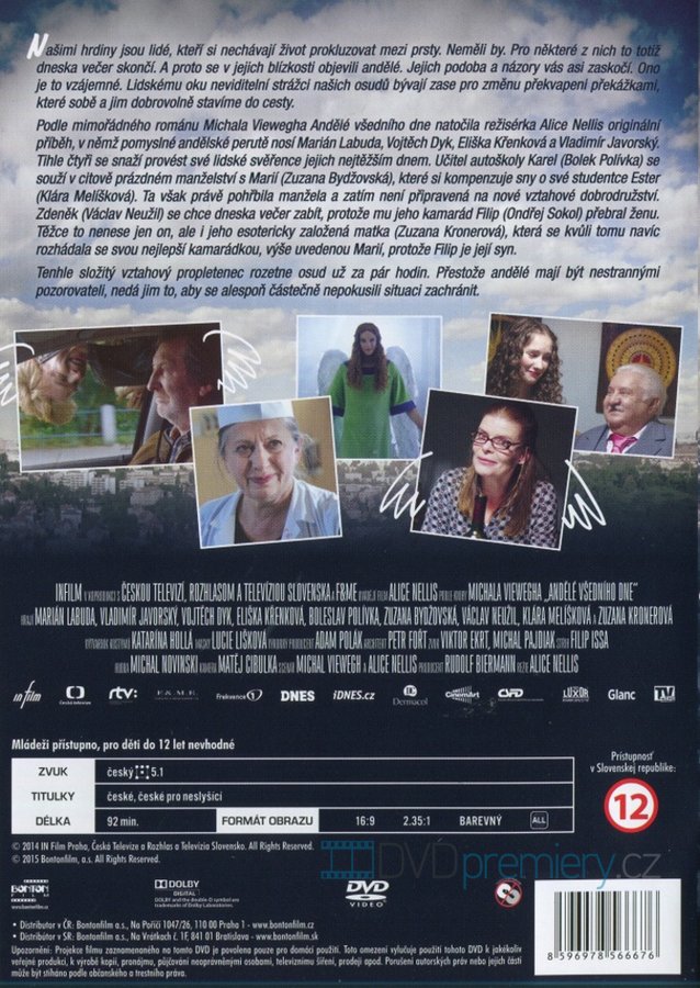Našimi hrdiny jsou lidé, kteří si nechávají život prokluzovat mezi prsty. Neměli by. Pro některé z nich to totiž dneska večer skončí. A proto se v jejich blízkosti objevili andělé. Jejich podoba a názory vás asi zaskočí. Ono je to vzájemné. Lidskému oku neviditelní strážci našich osudů bývají zase pro změnu překvapeni překážkami, které sobě a jim dobrovolně stavíme do cesty. Podle mimořádného románu Michala Viewegha Andělé všedního dne natočila režisérka Alice Nellis originální příběh, v němž pomyslné andělské perutě nosí Marián Labuda, Vojtěch Dyk, Eliška Křenková a Vladimír Javorský. Tihle čtyři se snaží provést své lidské svěřence jejich nejtěžším dnem. Učitel autoškoly Karel (Bolek Polívka) se souží v citově prázdném manželství s Marií (Zuzana Bydžovská), které si kompenzuje sny o své studentce Ester (Klára Melíšková). Ta však právě pohřbila manžela a zatím není připravená na nové vztahové dobrodružství. Zdeněk (Václav Neužil) se chce dneska večer zabít, protože mu jeho kamarád Filip (Ondřej Sokol) přebral ženu. Těžce to nenese jen on, ale i jeho esotericky založená matka (Zuzana Kronerová), která se kvůli tomu navíc rozhádala se svou nejlepší kamarádkou, výše uvedenou Marií, protože Filip je její syn. Tenhle složitý vztahový propletenec rozetne osud už za pár hodin. Přestože andělé mají být nestrannými pozorovateli, nedá jim to, aby se alespoň částečně nepokusili situaci zachránit.