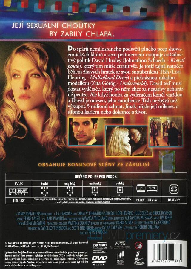 DVD film 8 mm 2 [2005]. Český dabing. České titulky. Dolby Digital. Skandální video zničí kariéru politika. Vyděrač, vražda, únos. Snoubence musí sehnat 5 milionů, nebo přijde o vše.