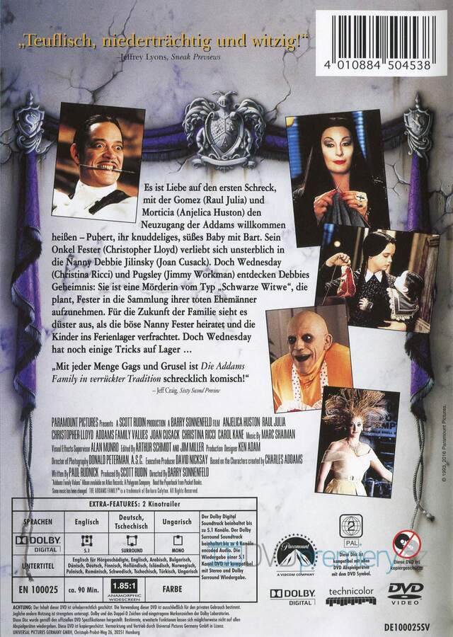 DVD film Addamsova rodina 2 [1992]. Český dabing. České titulky. Dolby Digital. Dovoz (DE). Fester se zamiluje do vražedné chůvy. Wednesday musí zachránit rodinu před "černou vdovou" Debbie.