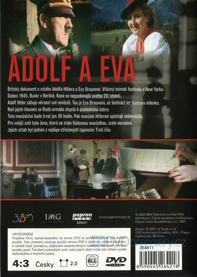 DVD film Adolf a Eva [2001]. Český dabing. Dolby Digital. Tajný vztah Hitlera a Evy Braunové. Svatba v bunkru 36 hodin před sebevraždou. Odhalení skrytého příběhu.