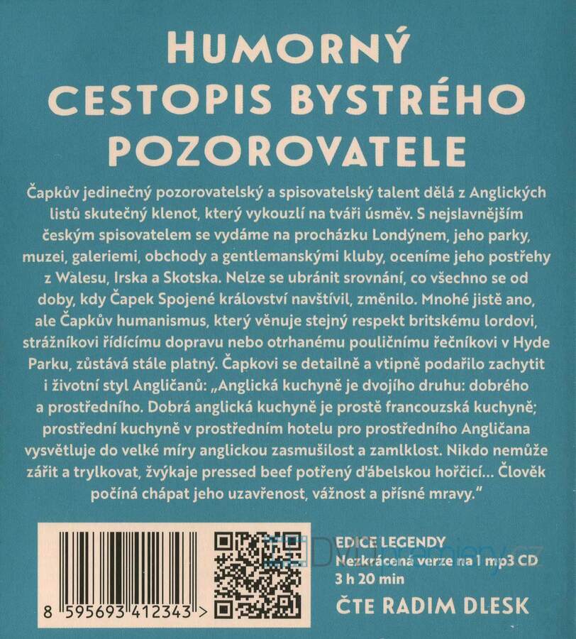 Audiokniha od autora: Karel Čapek, čte: Radim Dlesk. Délka nahrávky: 3 hodin, 20 minut. Čapkův brilantní pohled na Anglii. Vtipné fejetony plné postřehů z cesty roku 1924.
