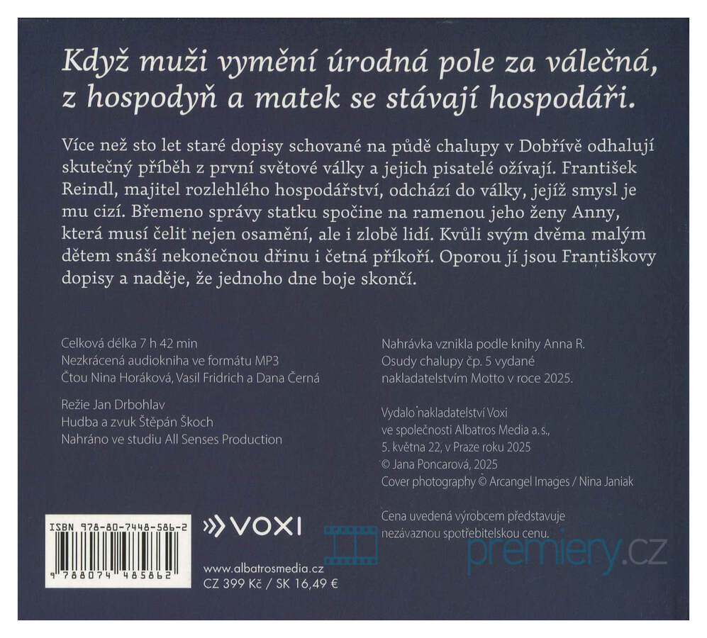Audiokniha od autora: Jana Poncarová, čte: Vasil Fridrich, Dana Černá, Nina Horáková. Délka nahrávky: 7 hodin, 42 minut. Když muž odešel do války, Anna převzala vše. Skutečný příběh síly, lásky a přežití z dopisů z půdy.