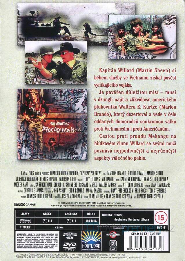 DVD film Apokalypsa [1979]. Český dabing. České titulky. Dolby Digital. Prodloužená verze. Režie: Francis Ford Coppola. Hrají: Marlon Brando, Robert Duvall, Martin Sheen. Držitel 2 Oscarů: nejlepší kamera a zvuk.