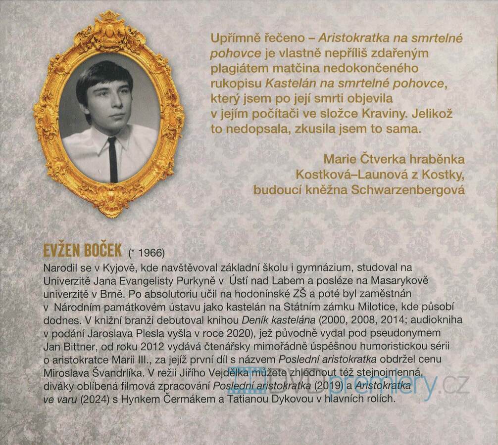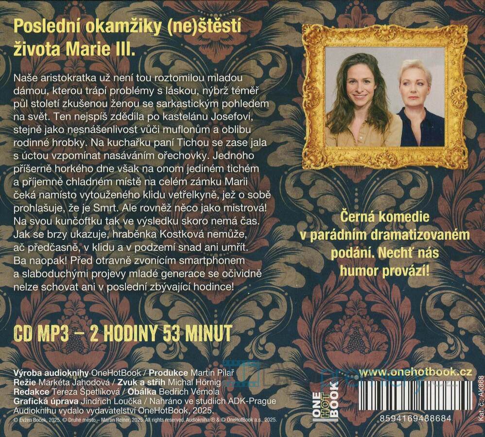 Naše aristokratka už není tou roztomilou mladou dámou, kterou trápí problémy s láskou, nýbrž téměř půl století zkušenou ženou se sarkastickým pohledem na svět. Ten nejspíš zdědila po kastelánu Josefovi, stejně jako nesnášenlivost vůči muflonům a oblibu rodinné hrobky. Na kuchařku paní Tichou se zase jala s úctou vzpomínat nasáváním ořechovky. Jednoho příšerně horkého dne však na onom jediném tichém a příjemně chladném místě na celém zámku Marii čeká namísto vytouženého klidu vetřelkyně, jež o sobě prohlašuje, že je Smrt. Ale rovněž něco jako mistrová! Na svou kunčoftku tak ve výsledku skoro nemá čas. Jak se brzy ukazuje, hraběnka Kostková nemůže, ač předčasně, v klidu a v podzemí snad ani umřít. Ba naopak! Před otravně zvonícím smartphonem a slaboduchými projevy mladé generace se očividně nelze schovat ani v poslední zbývající hodince!