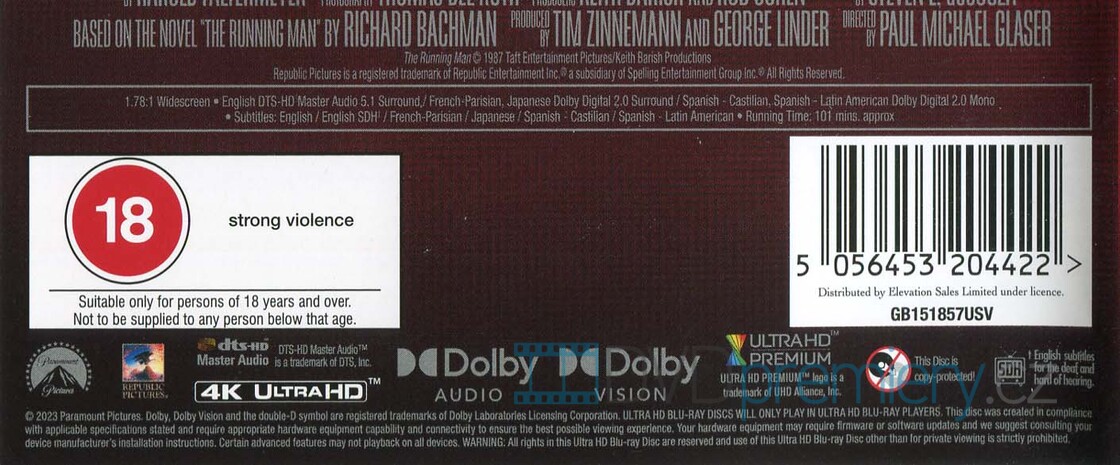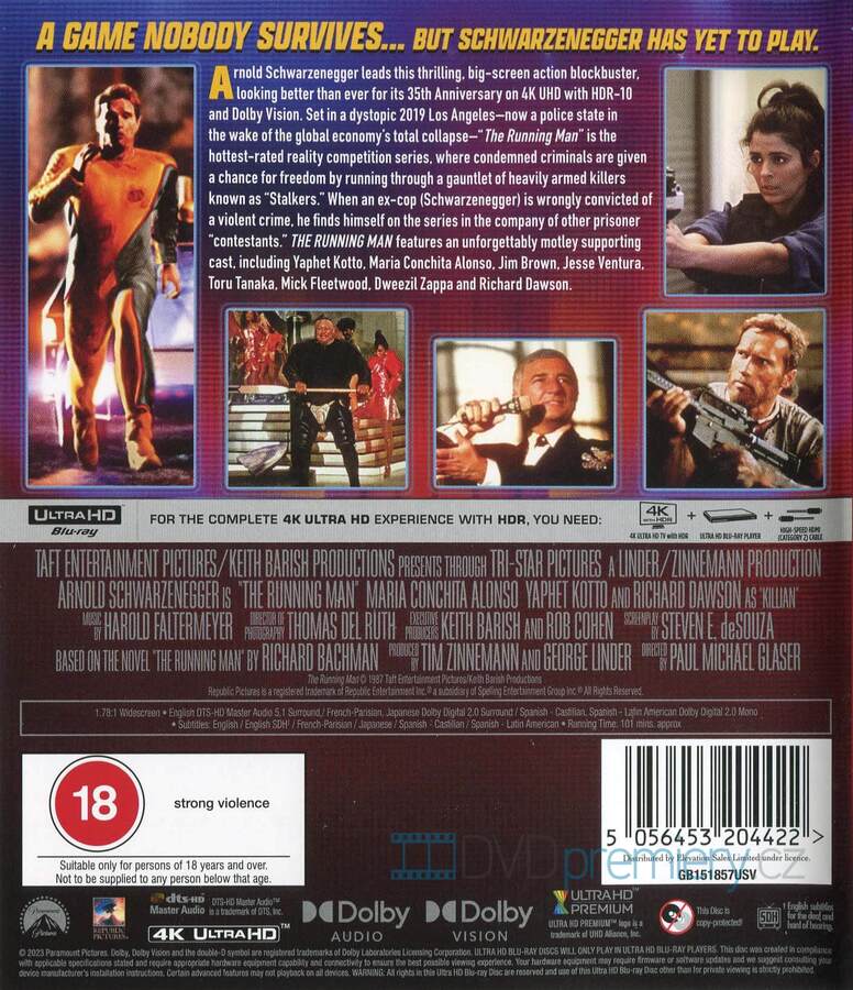 4K Blu-ray film Běžící muž HD [1987]. Bez CZ podpory. HDR. Dolby Digital. Dovoz. Schwarzenegger v kultovním thrilleru nyní v oslnivé 4K UHD kvalitě – přežij smrtící show, nebo zemři!