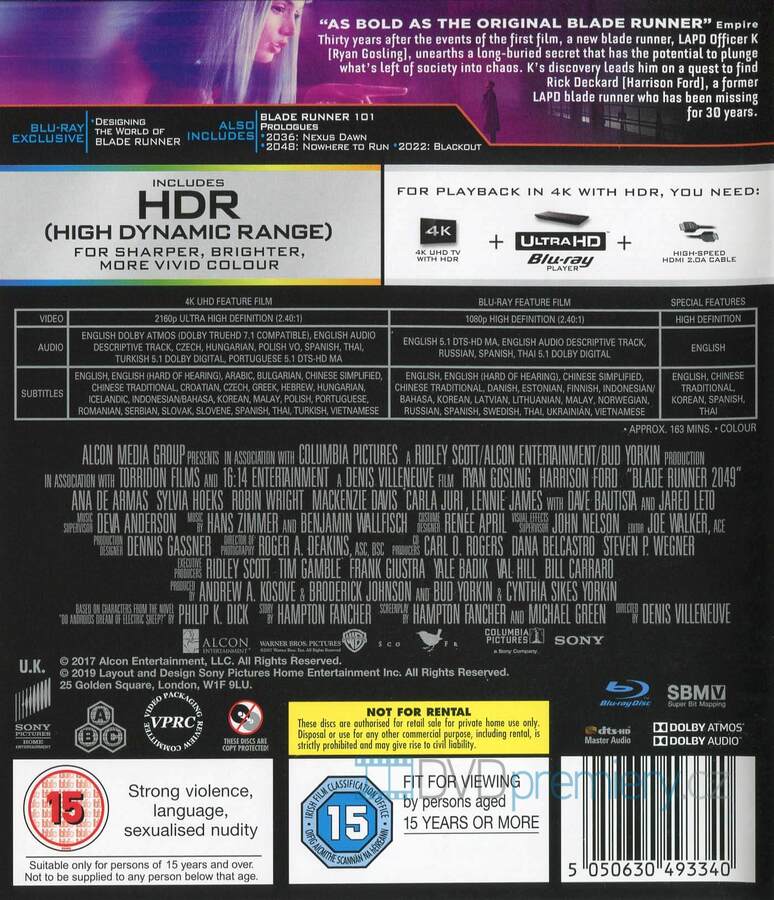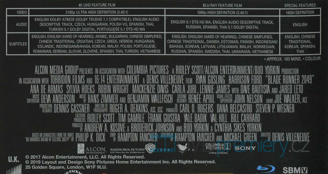 4K Blu-ray film Blade Runner 2049 HD [2017]. Český dabing. České titulky. HDR. Dolby Digital. Dolby Atmos. Dovoz. Nový blade runner K odhalí tajemství, které otřese světem. Jeho stopa vede k zmizelému Deckardovi.