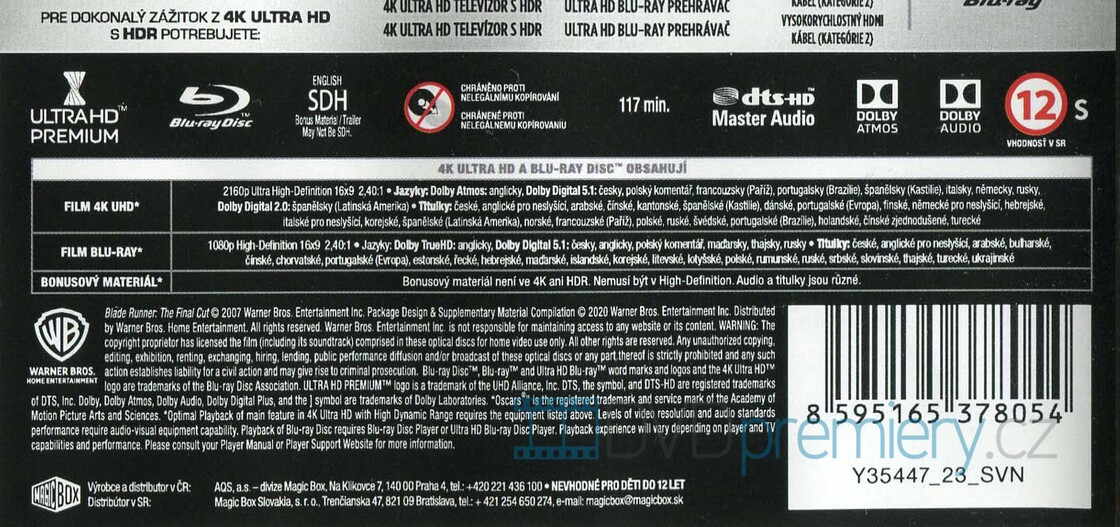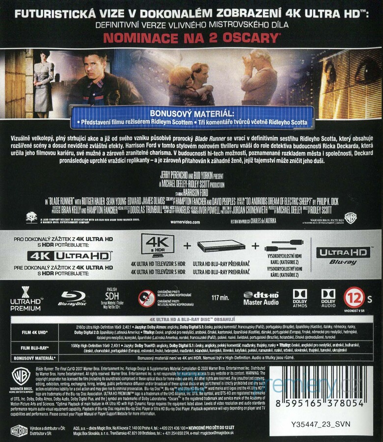 4K Blu-ray film Blade Runner HD [1982]. 2 disky. Český dabing. České titulky. HDR. Dolby Digital. Dolby Atmos. Zdokonalená futuristická vize: Definitivní verze kultovního díla sci-fi filmu.
