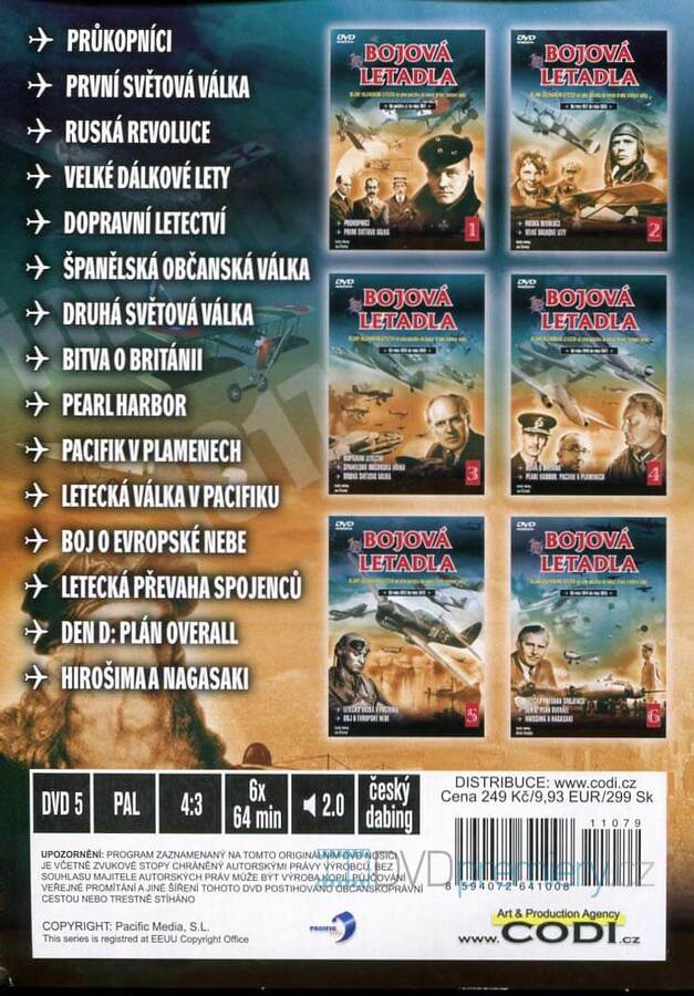 DVD dokumentární film Bojová letadla 6 DVD. Český dabing. Dolby Digital. Dějiny vojenského letectví od jeho počátků do konce druhé světové války.