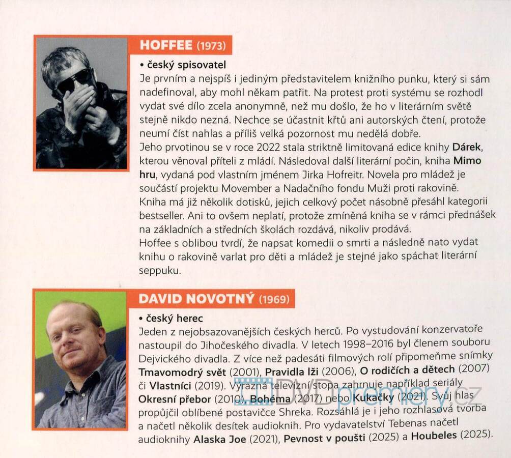 Audiokniha od autora: Hoffee, čte: David Novotný. Délka nahrávky: 6 hodin, 57 minut. Autofiktivní dokument o cestě na Onen svět. Nadsázkou vyprávěná cesta k přijetí vlastního konce.