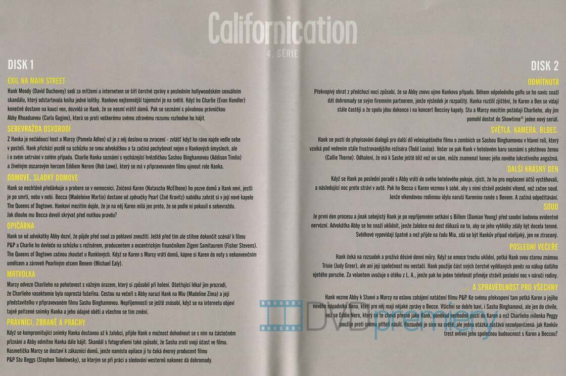 Třetí kapitola originální série Californication televize Showtime se uzavřela ve chvíli, kdy nepolepšitelný spisovatel míří do vězení za útok na přítele své provokativní nezletilé ex milenky Mii. Sen o domově s Karen a Beccou se ocitá v troskách, ale díky skandálu kolem jeho nové knihy se z Hanka v Hollywoodu stává v mnoha ohledech žádané zboží. Dokáže proplout chaosem, který vládne v jeho životě a vyjít z něho jako vítěz? Odpověď nabízí tato dvě DVD s 12 dekadentně nestydatými epizodami ze čtvrté řady.