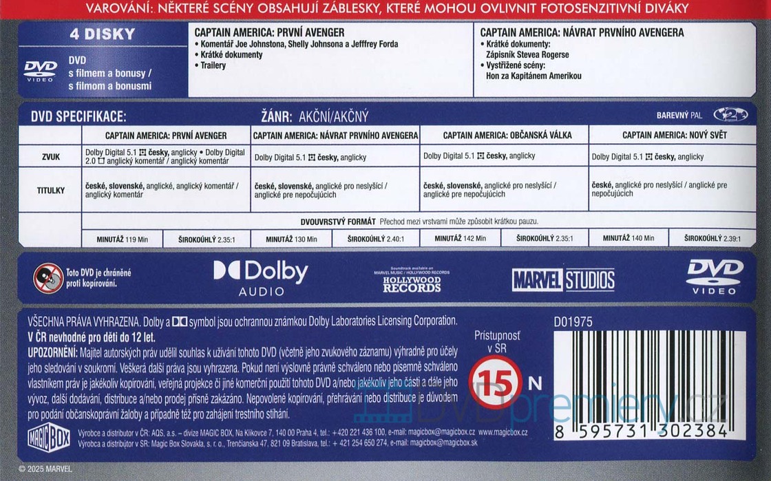 DVD kolekce obsahuje filmy: Captain America: První Avenger, Captain America: Návrat prvního Avengera, Captain America: Občanská válka, Captain America: Nový svět. CZ dabing.