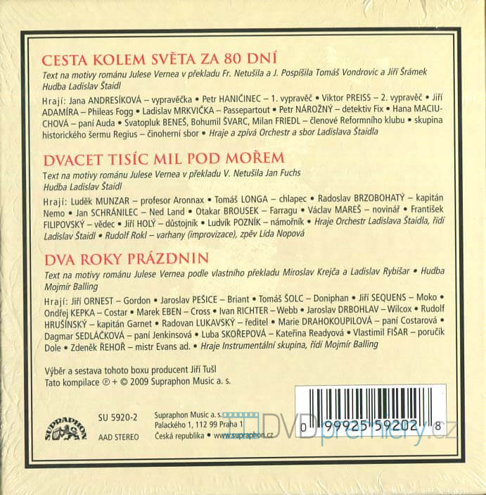 Vyprávět obsah tří z nejznámějších románů Julese Vernea by jistě bylo jako nosit dříví do lesa. Supraphon vám nabízí jejich velkolepé dramatizace s našimi předními herci hned na pěti albech. Avy se sami rozhodnete, zda se vydáte na cestu kolem světa sanglickým gentlemanem Phileasem Foggem, nebo se stanete nedobrovolnými účastníky podmořských plaveb kapitána Nema v jeho ponorce Nautilus, či zda strávíte se skupinou chlapců školou povinných až příliš dobrodružné prázdniny na opuštěném ostrově. Prázdniny, které se protáhnou na celé dva roky. Ať zvolíte cokoliv, zvolíte dobře. Stejně to časem prostřídáte, abyste stihli všechno.