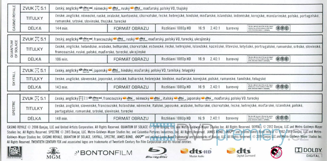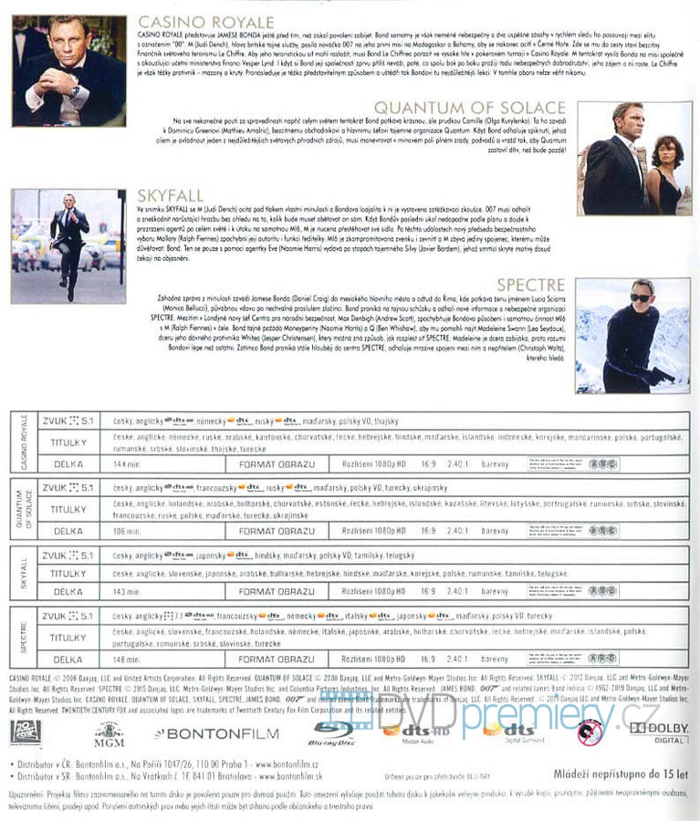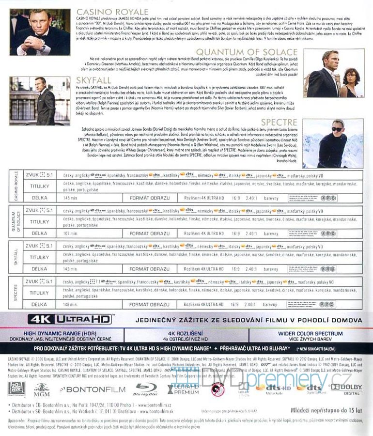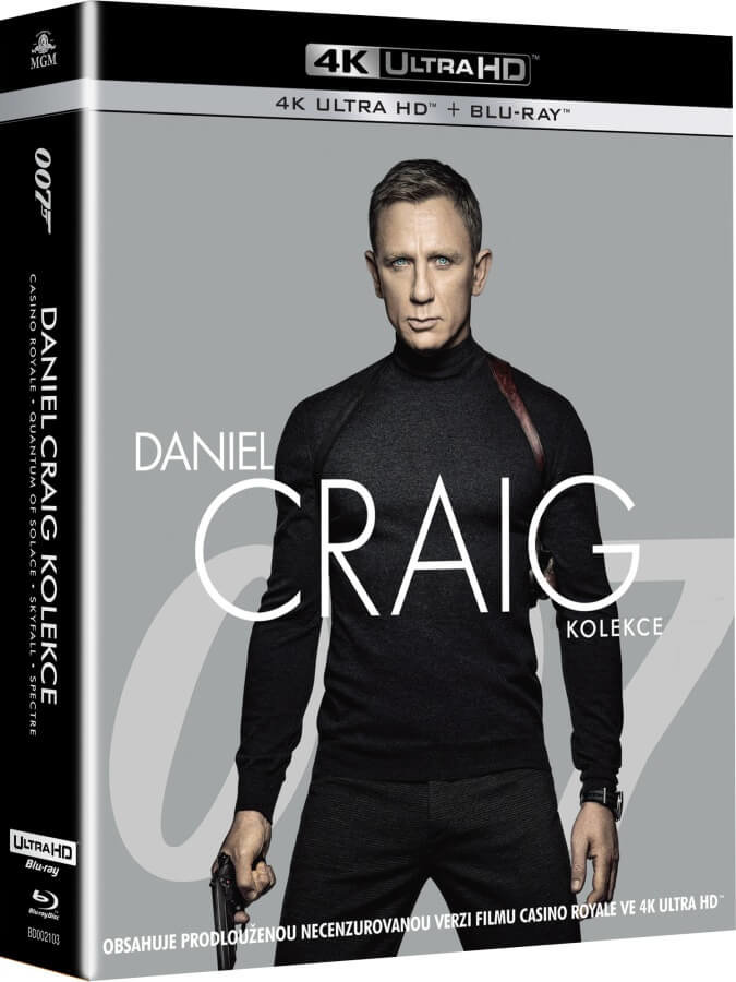 Daniel Craig James Bond kolekce obsahuje filmy: Casino Royale (4K ULTRA HD+BLU-RAY), Quantum of Solace (4K ULTRA HD+BLU-RAY), Skyfall (4K ULTRA HD+BLU-RAY), Spectre (4K ULTRA HD+BLU-RAY).