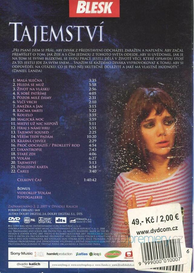 DVD film Daniel Landa - muzikál Tajemství [2007]. Dolby Digital. Natočeno 2.2.2007 v divadle Kalich.