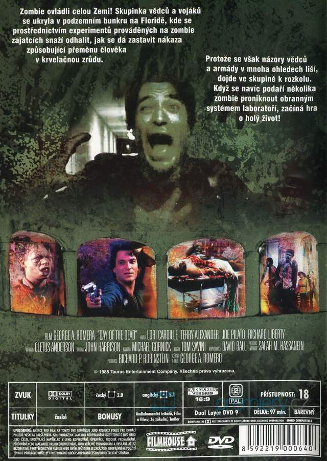 DVD film Den mrtvých [1985]. Český dabing. České titulky. Dolby Digital. Zombie ovládli zemi. Den mrtvých nadešel. Film George A. Romera.