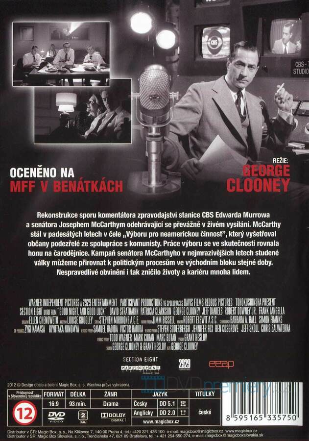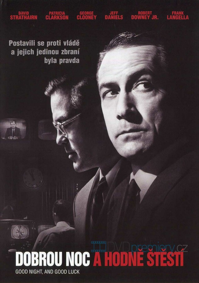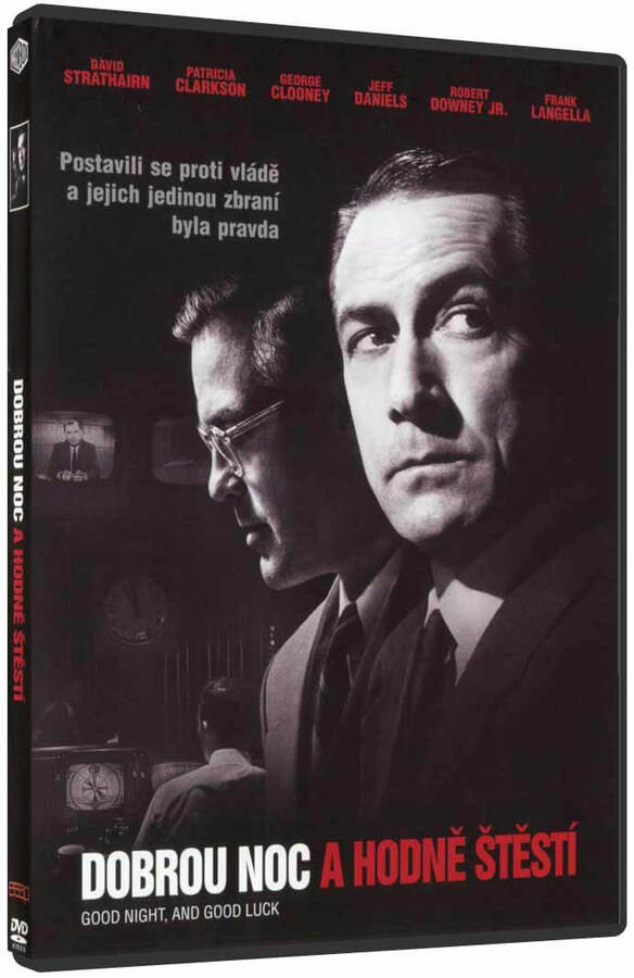 DVD film Dobrou noc a hodně štěstí [2005]. Český dabing. České titulky. Černobílý snímek o odvážném boji novináře Murrowa proti McCarthyho hon na čarodějnice. 5 ocenění na MFF v Benátkách 2005.