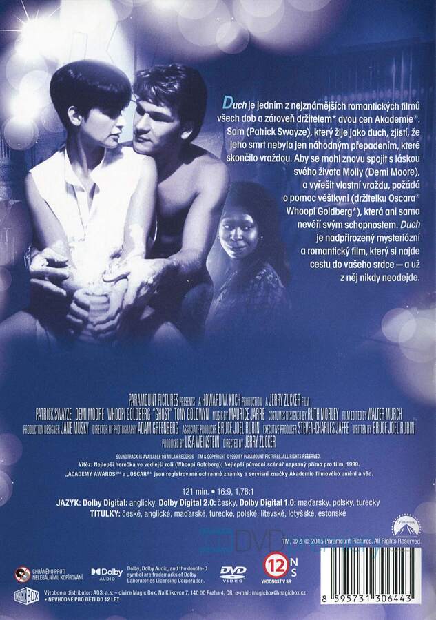 DVD film Duch [Ghost, 1990]. Český dabing. České titulky. Dolby Digital. Držitel 2 Oscarů - Nejlepší herečka ve vedlejší roli a Nejlepší původní scénář.