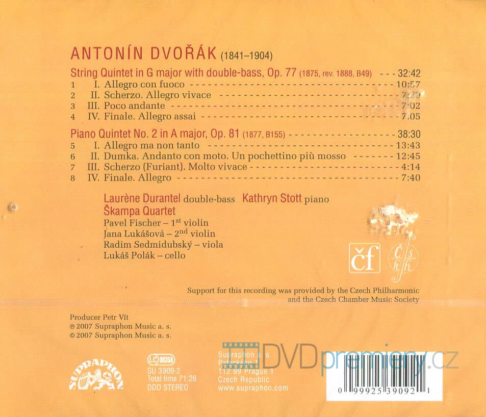 Škampovo kvarteto, které se etablovalo nahrávkami především českých skladatelů (Janáček, Dvořák, Smetana), si pro svou novou nahrávku vybralo dva líbezné kvintety z Dvořákova zralého období. V KvintetuG dur se temperament a vitalita krajních vět střídá s dvořákovsky jemnou lyrikou pomalé věty. Klavírní part Kvintetu A dur je neobyčejně brilantní a pianisticky vděčný. Dvořákovi se zde podařilodosáhnout ideální symbiózy zvuku klavíru se smyčcovými nástroji. Škampovcům jsou na nahrávce rovnocennými partnery nadějná francouzská kontrabasistka Laurene Durantel a charismatická britská pianistka Kathryn Stott. Kathryn je vyhledávanou komorní hráčkou. Má na kontě řadu premiér (koncerty Sira Petera Maxwella Daviese a Michaela Nymana) a dlouhodobá spolupráce ji váže k hudebníkům jako Yo-Yo Ma čiJanine Jansen.