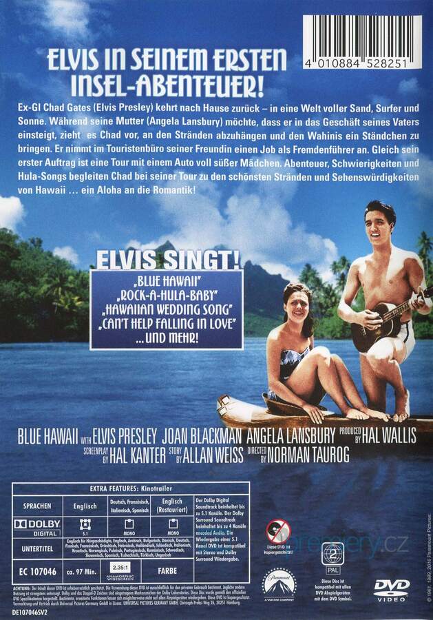 DVD film Blue Hawaii [1961]. České titulky. Dolby Digital. V podání Elvise ve filmu zazní Blue Hawaii, Rock-A-Hula-Baby, Hawaiian Wedding Song, Can’t Help Falling In Love ...a další!