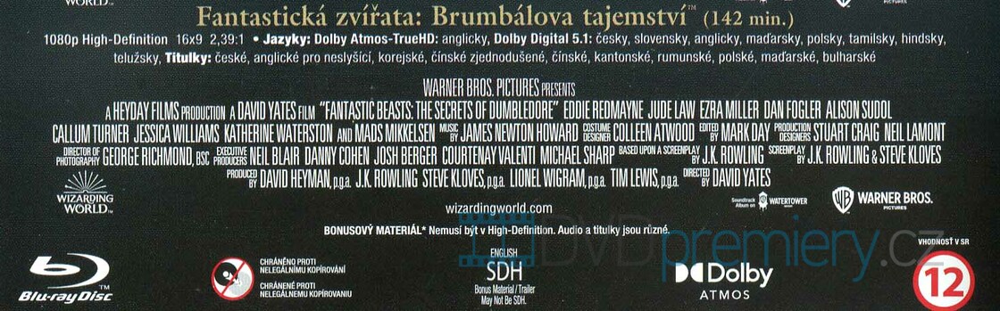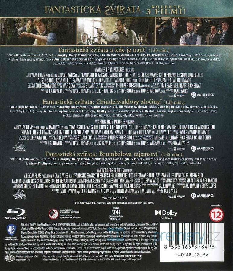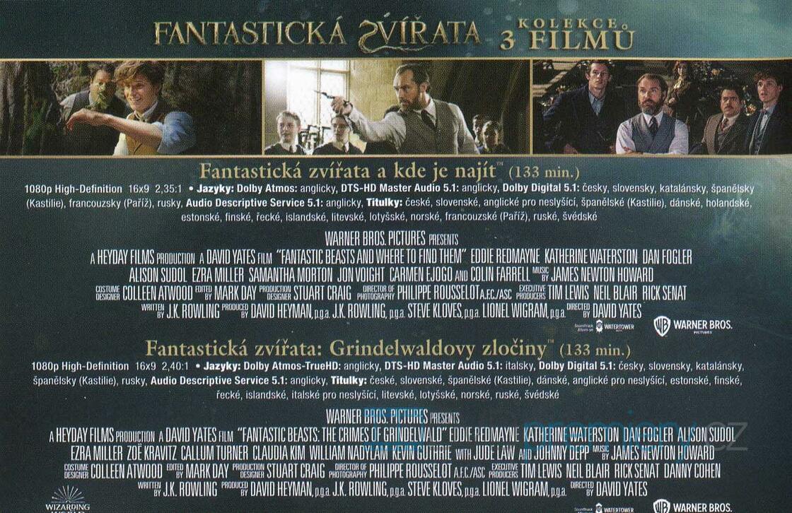 Blu-ray kolekce obsahuje filmy: Fantastická zvířata a kde je najít, Fantastická zvířata 2: Grindelwaldovy zločiny, Fantastická zvířata 3: Brumbálova tajemství. Český dabing. České titulky. Dolby Digital. DOLBY ATMOS.