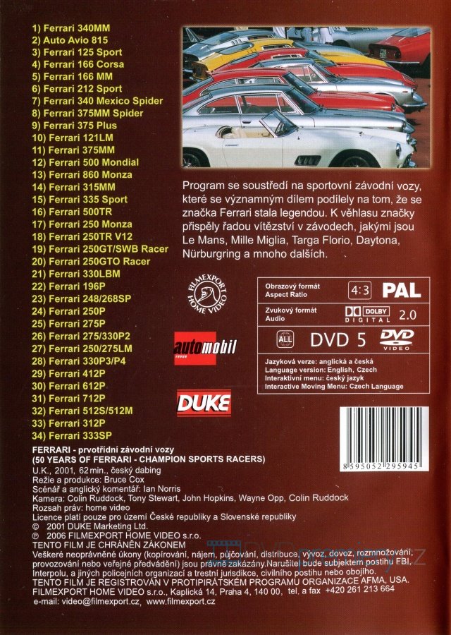 DVD se soustředí na sportovní závodní vozy, které se významným dílem podílely na tom, že se značka Ferrari stala legendou. K věhlasu značky přispěly řadou vítězství v závodech, jakými jsou le Mans, Mile Miglia, targa Florio, Daytona,...