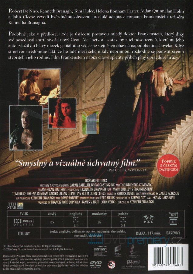 Robert De Niro, Kenneth Branagh, Tom Hulce, Helena Bonham Carter, Aidan Quinn, Ian Holm a John Cleese vévodí hvězdnému obsazení proslulé adaptace románu Frankenstein režiséra Kennetha Branagha.
