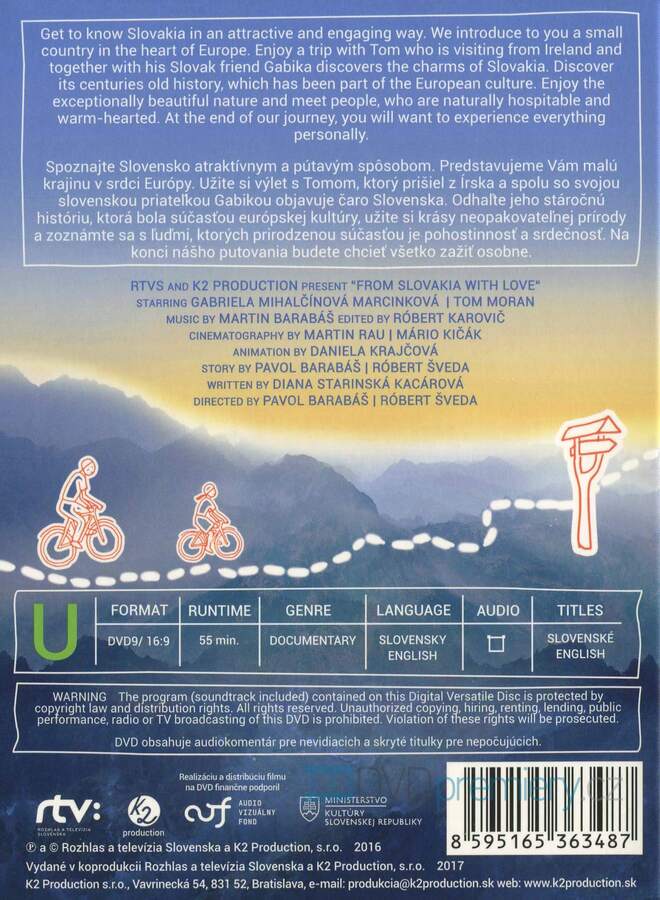 DVD film From Slovakia With Love [2015]. Slovenský film. Dolby Digital. Irský student a slovenská herečka na kolech napříč Slovenskem. Cesta plná objevů, sportu a nečekaných zvratů.