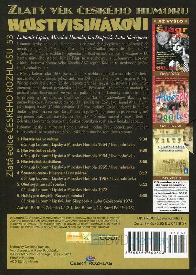 CD záznam Hlustvisihákovi, hrají: Lubomír Lipský, Miroslav Homola, Jan Skopeček, Luba Skořepová.