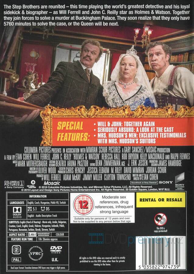 DVD film Holmes a Watson [2018]. Český dabing. České titulky. Dolby Digital. Dovoz. Ferrell a Reilly jako Holmes & Watson: vražda v paláci a jen 96 hodin do další oběti. Královna je v ohrožení!