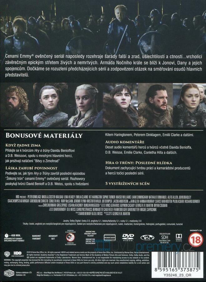 DVD seriál Hra o trůny - 8. série [Game of Thrones 8, 2018]. Český dabing. České titulky. Dolby Digital. Faleš a zrada, ušlechtilost a čest. Sběratelské balení.