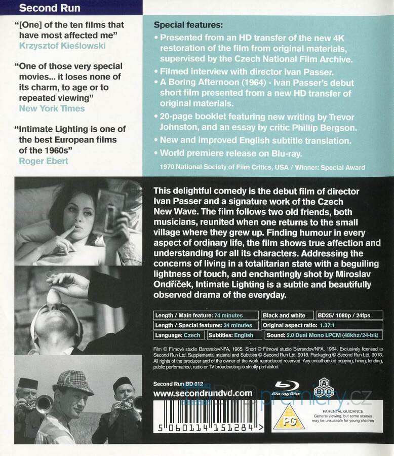 Tato půvabná komedie je debutovým filmem režiséra Ivana Passera a charakteristickým dílem české nové vlny. Film sleduje dva staré přátele, oba hudebníky, kteří se znovu setkají, když se jeden z nich vrací do malé vesnice, kde vyrůstali. Film nachází humor v každém aspektu běžného života a projevuje skutečnou náklonnost a porozumění ke všem svým postavám. Film Intimní osvětlení, který s okouzlující lehkostí pojednává o problémech života v totalitním státě a je nádherně natočen Miroslavem Ondříčkem, je jemným a krásně zachyceným dramatem každodenního života.
