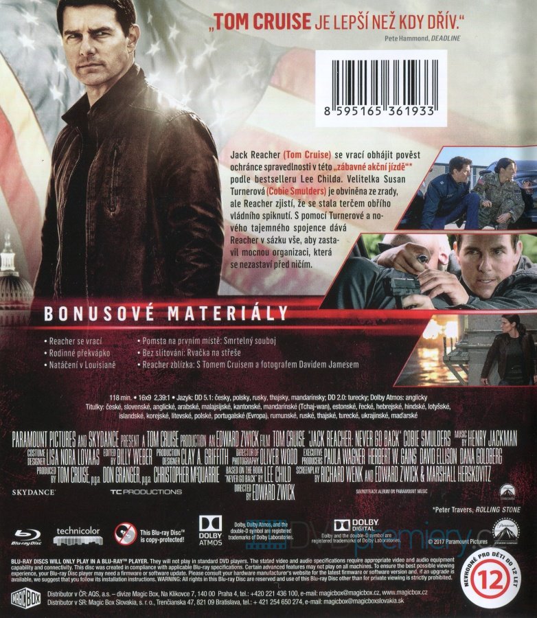 Blu-ray HD film Jack Reacher: Nevracej se [Jack Reacher: Never Go Back, 2016]. Český dabing. České titulky. Dolby Digital. Dolby Atmos. Hrají: Tom Cruise.