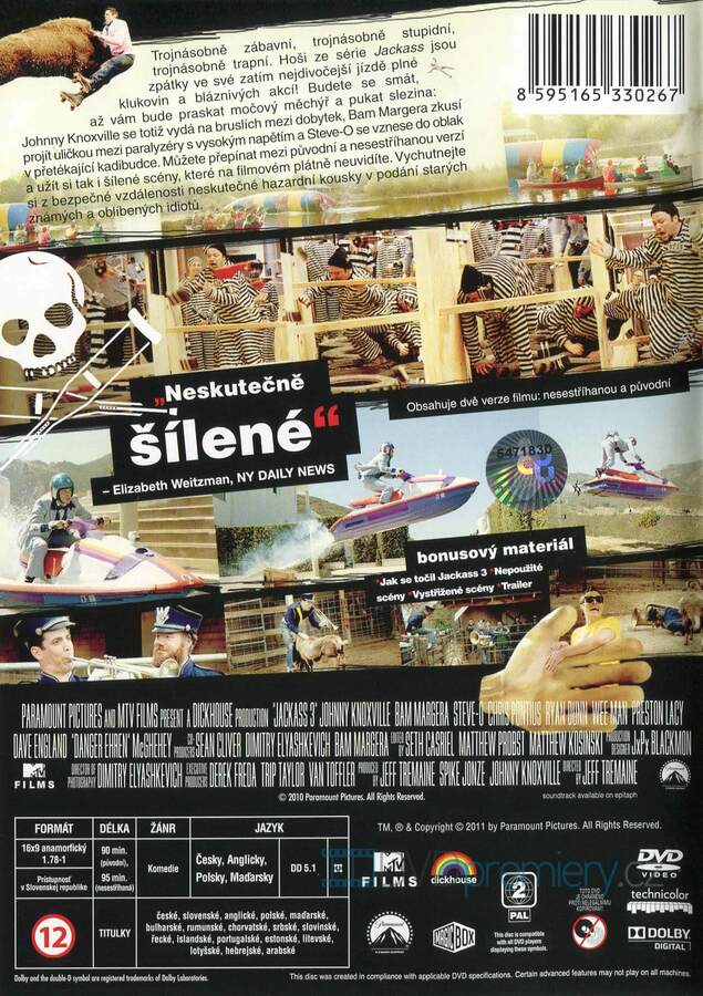 DVD film Jackass 3 [2010]. Český dabing. České titulky. Dolby Digital. Jackass v nejdivočejší jízdě! Šílené kousky, neskutečné akce a nesestříhaná verze. Smích zaručen!