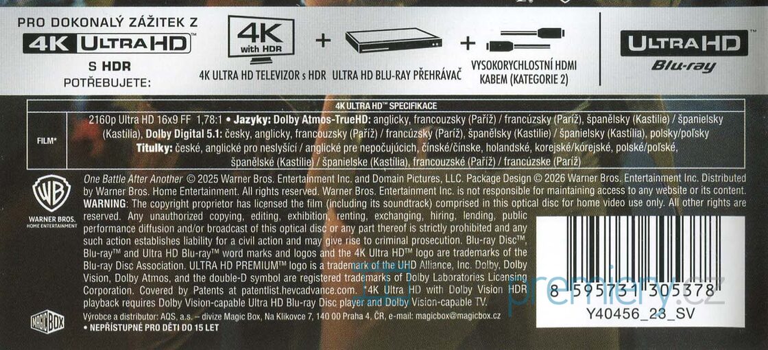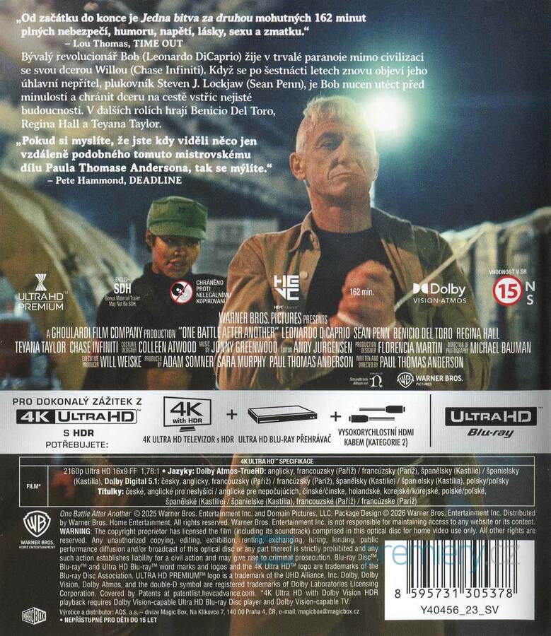 4K Blu-ray film Jedna bitva za druhou HD [2025]. Český dabing. České titulky. HDR. Dolby Digital. Dolby Atmos. Paranoia, izolace a návrat starého nepřítele. Otec musí ochránit dceru za každou cenu.