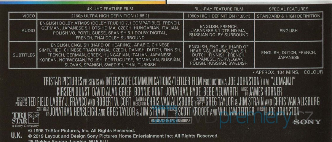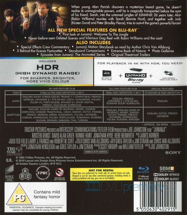 4K Blu-ray film Jumanji HD [1995]. Český dabing. České titulky. HDR. Dolby Digital. Dolby Atmos. Kouzlo, džungle a chaos! Robin Williams v magickém dobrodružství, kde hra Jumanji mění životy navždy.