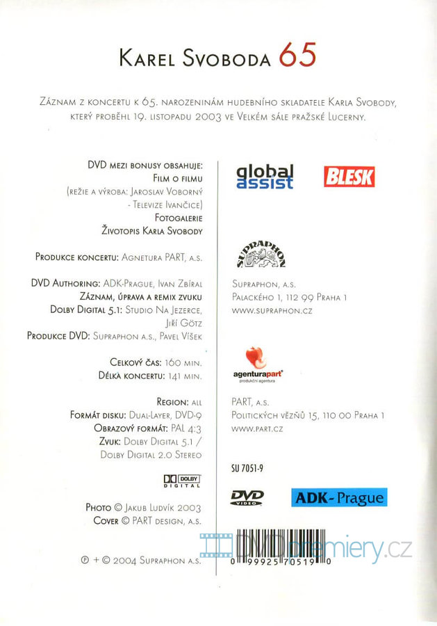 Záznam z koncertu k 65. narozeninám hudebního skladatele Karla Svobody, který se uskutečnil 19. listopadu 2003 ve Velkém sále pražské Lucerny, dost možná znáte z předvánočního vysílání televize Prima. S jeho úplnou, nesestříhanou podobu se nyní můžete seznámit na DVD, které přináší plejádu hvězd naší populární hudby v čele s Helenou Vondráčkovou a Karlem Gottem. Za zmínku stojí i širokáškála bonusů, která zahrnuje především dokumentární Film o filmu, biografii hlavního protagonisty i bohatou fotogalerii, ať už jde o barevné momentky ze zmíněného koncertu nebo černobílé snímky z rodinného alba. Samozřejmostí je propracované interaktivní menu, ve zvuku můžete volit mezi obligátním stereem a prostorovým pětikanálovým zvukem ve formátu Dolby Digital 5.1.