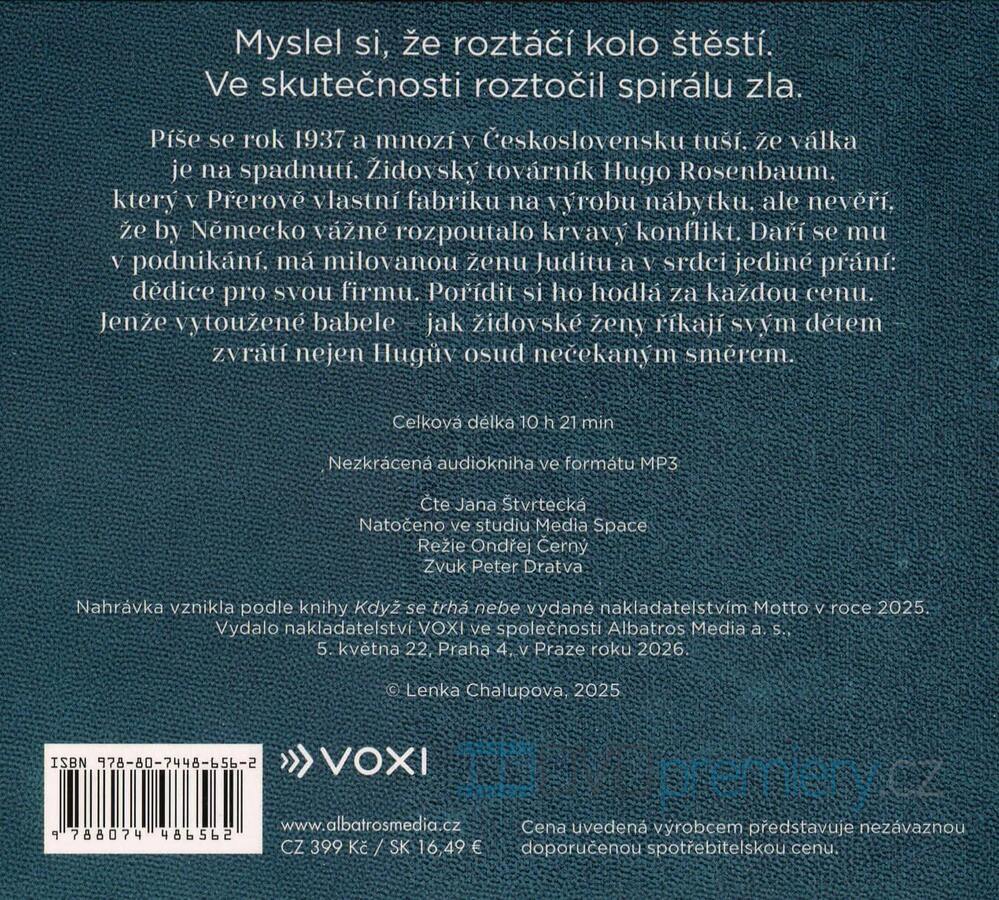 Audiokniha od autora: Lenka Chalupová, čte: Jana Štvrtecká. Délka nahrávky: 10 hodin, 21 minut. Přerov 1937. Úspěšný továrník Hugo touží po dědici. Netuší, že dítě změní jeho osud víc než blížící se válka.