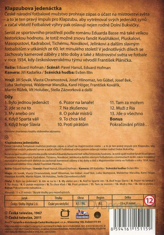 DVD film Klapzubova jedenáctka [1968]. Český TV seriál. Dolby Digital. Seriál z fotbalového prostředí podle románu Eduarda Basse.