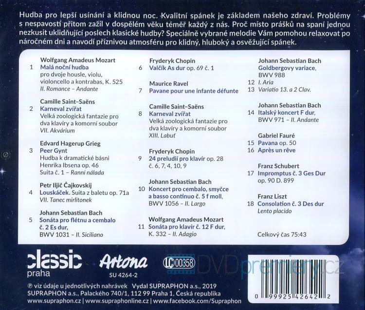 Kvalitní spánek je základem našeho zdraví. Problémy s nespavostí přitom zažil v dospělém věku téměř každý z nás. Proč místo prášků na spaní jednou nezkusit uklidňující poslech klasické hudby? Speciálně vybrané melodie Vám pomohou relaxovat po náročném dni a navodí příznivou atmosféru pro klidný, hluboký a osvěžující spánek.