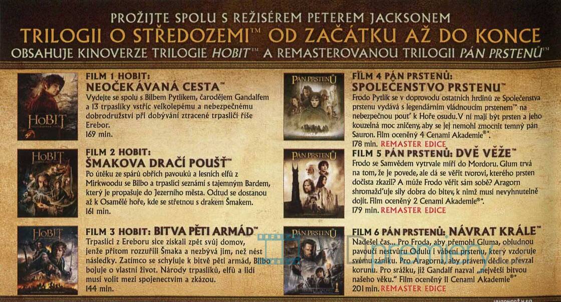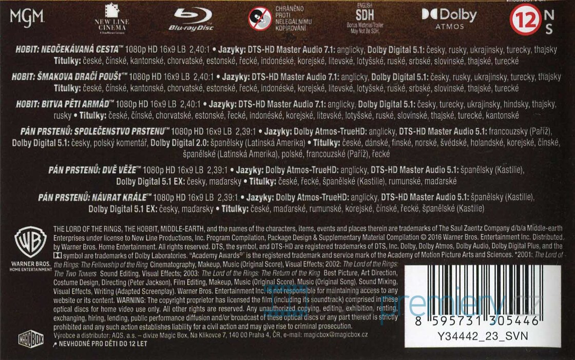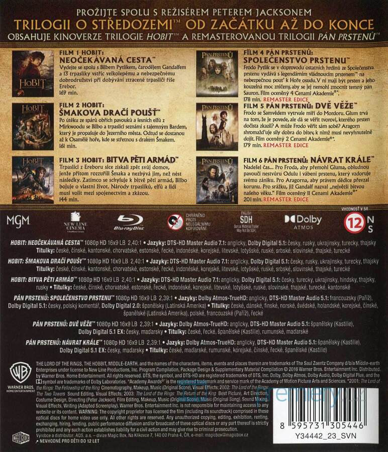 Blu-ray kolekce Středozemě obsahuje Remasterované kino verze: Pán prstenů: Společenstvo Prstenu, Pán prstenů: Dvě věže, Pán prstenů: Návrat krále, Hobit: Neočekávaná cesta, Hobit: Šmakova dračí poušť, Hobit: Bitva pěti armád. CZ dabing.