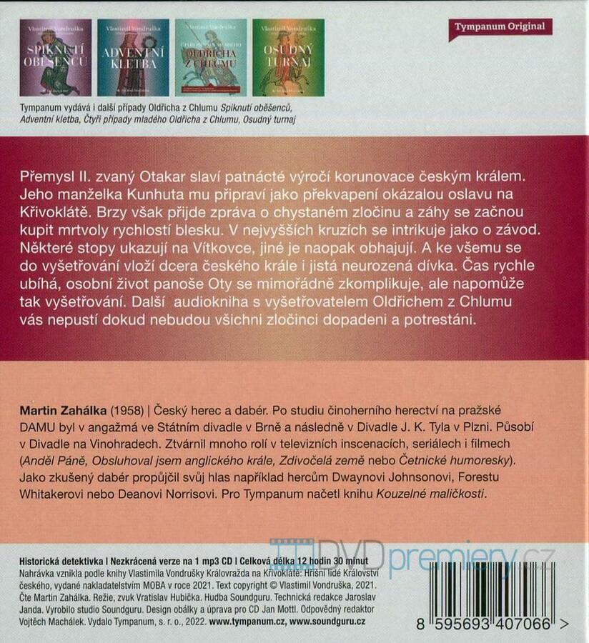 Audioknihu Královražda na Křivoklátě napsal autor: Vlastimil Vondruška, čte: Martin Zahálka. Celková stopáž: 12 hodin, 36 minut.