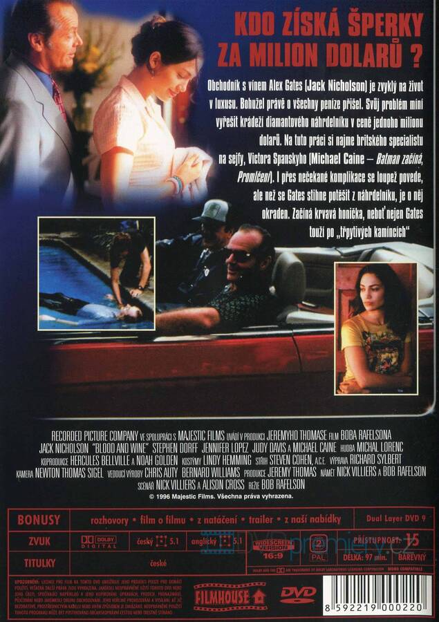 DVD film Krev a víno [1996]. Český dabing. České titulky. Dolby Digital. Dokonalá loupež, nečekaná zrada a boj o milionový náhrdelník. Nicholson a Caine v napínavém thrilleru o chamtivosti a přežití.