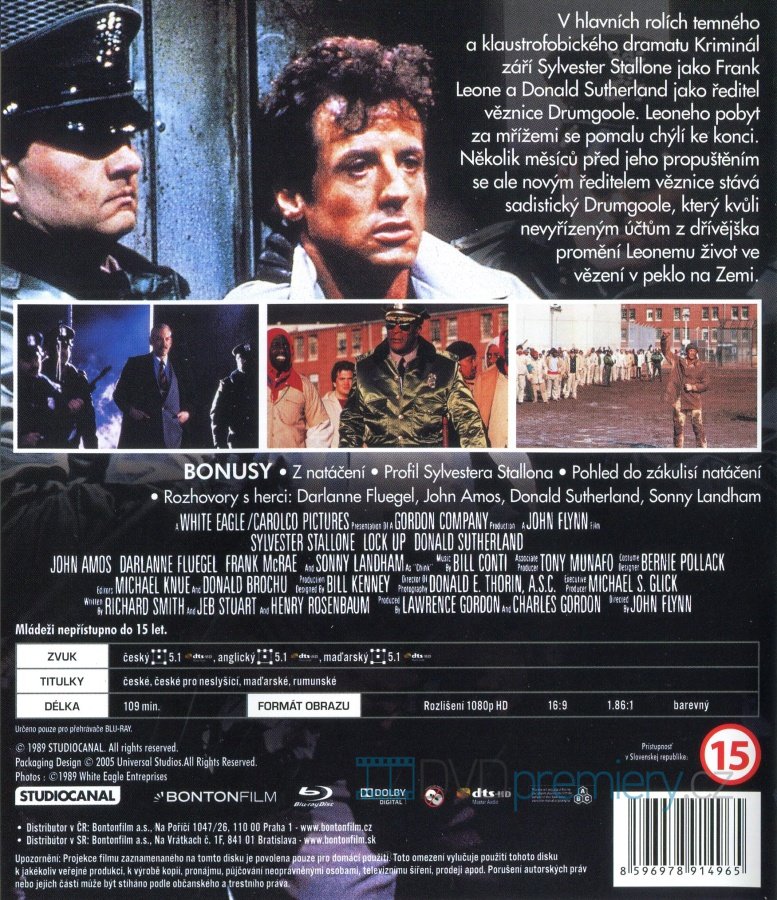 „Tohle je peklo a já tě v něm provedu!“ Mrazivá slova šéfa věznice (Donald Sutherland) vítají Franka Leoneho (Sylvester Stallone) v Gateway Prison, kde je každá minuta dlouhá jako život sám. Dozorce touží pomstít minulost, Leone se snaží přežít přítomnost. Strhující souboj vůlí dvou mužů je ústředním motivem Kriminálu, který patří k nejpůsobivějším Stallonovým filmům. Stallone jako Leone exceluje, když ho bezohledný protivník nutí porušit jeho vlastní pravidla. A ocenění za roli sadistického ředitele věznice si v téhle drsné jízdě do pekel a zpátky zaslouží i Sutherland.