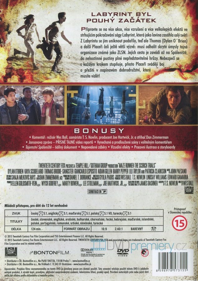 Připravte se na více akce, více vzrušení a více velkolepých efektů ve strhujícím pokračování ságy Labyrint, která jako lavina zasáhla celý svět! Když Thomas a jeho kamarádi dokázali uniknout z vražedného labyrintu, doufali, že se dokážou vrátit ke svým starým životům. Nemohli se ale splést víc. Místo svobody je čekal pouhý postup do druhé fáze zkoušky připravené organizací Z.L.S.N. Pro Thomase a ostatní přeživší Placery z labyrintu tak běhání zdaleka nekončí. Jejich další útěk je zavede na Spáleniště, nejvíce sežehnutou část planety, krajinu plnou nepředstavitelných překážek. Sluneční erupce sežehly Zemi na popel a proměnily ji v pustinu. Světové vlády se zhroutily – a s nimi i řád a právo. Rozpadajícími se troskami měst teď bloudí takzvaní „raplové", lidé pokrytí hnisajícími ranami, které nakažlivý virus dohnal za hranu příčetnosti. Jejich jediným cílem je najít cokoliv živého, aby se nasytili. Thomas a jeho přátelé musí rychle najít bezpečné útočiště a organizace Z.L.S.N. se stará o hlavně to, aby jim šance na přežití nastavila v jejich neprospěch. Placeři se ale dokáží spojit s bojovníky odporu, zasáhnout vrchní velení Z.L.S.N. a odhalit tak další šokující plány, které si pro ně společnost přichystala. Thomase čeká tvrdá zkouška ohněm. Skutečně se někde uvnitř v jeho hlavě skrývá tajemství, které je zachrání?