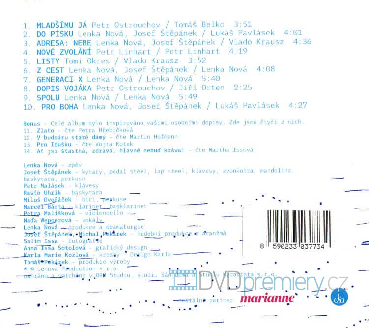 CD album Lenka Nová: Dopisy (2020). Lenka Nová vydává nové album Dopisy. Je přesvědčena, že hudba může v této složité době lidem pomoci a první reakce potvrzují, že udělala správně.
