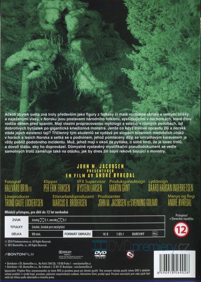 Zbytek světa zná troly především jako figury z fantasy či malé roztomilé skřítky s velkými bříšky a naježenými vlasy, v Norsku jsou postavami národního folkloru, vystupujícími v báchorkách, které čtou rodiče dětem před spaním. Mají vlastní propracovanou mytologii a existují v různých podobách, od dobrotivých bytůstek po gigantická krvežíznivá monstra. Jenže co když trolové opravdu žijí a norská vláda jejich existenci tají? Tříčlenný tým studentů se vydává po stopách bizarních medvědích útoků v horách a lesích Norska a setká se s podivínem, jehož pomlácený džíp se smradlavým karavanem je vždy poblíž podobného incidentu. Muž, jehož mají v okolí za pytláka, o sobě tvrdí, že je lovec trolů, a dovolí štábu, aby ho doprovázel. Důmyslně vystavěný mystifi kační pseudodokument se vedle samotných trolů zaměřuje také na otázku, jak by dnes žili bájní rekové bojující s monstry.