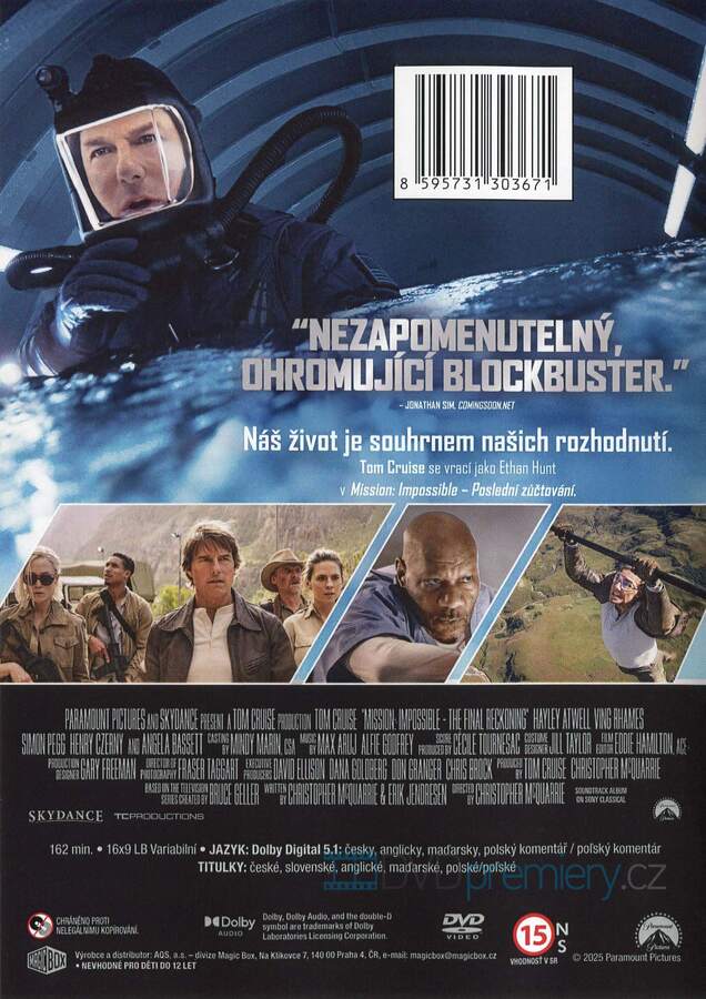 DVD film Mission: Impossible 8 - Poslední zúčtování [2025]. Český dabing. České titulky. Dolby Digital. Tom Cruise jako Ethan Hunt se vrací v ultimátní misi, kde čas vypršel. Svět potřebuje záchranu - a nemožné je jen otázkou rozhodnutí.
