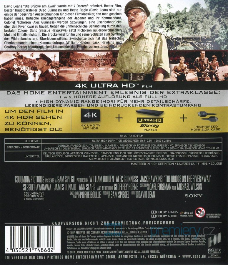 4K UHD BLU-RAY s filmem Most přes řeku Kwai (1957) nyní 4x ostřejší než v rozlišení HD. Obsahuje HDR pro jasnější, hlubší a živější barvy.
