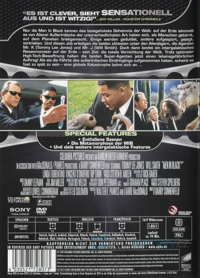 DVD film Muži v černém [1997]. České titulky. Dolby Digital. Dovoz. Dva superagenti loví mimozemšťany na Zemi. Teď čelí největší hrozbě - vetřelci, který chce zničit svět!